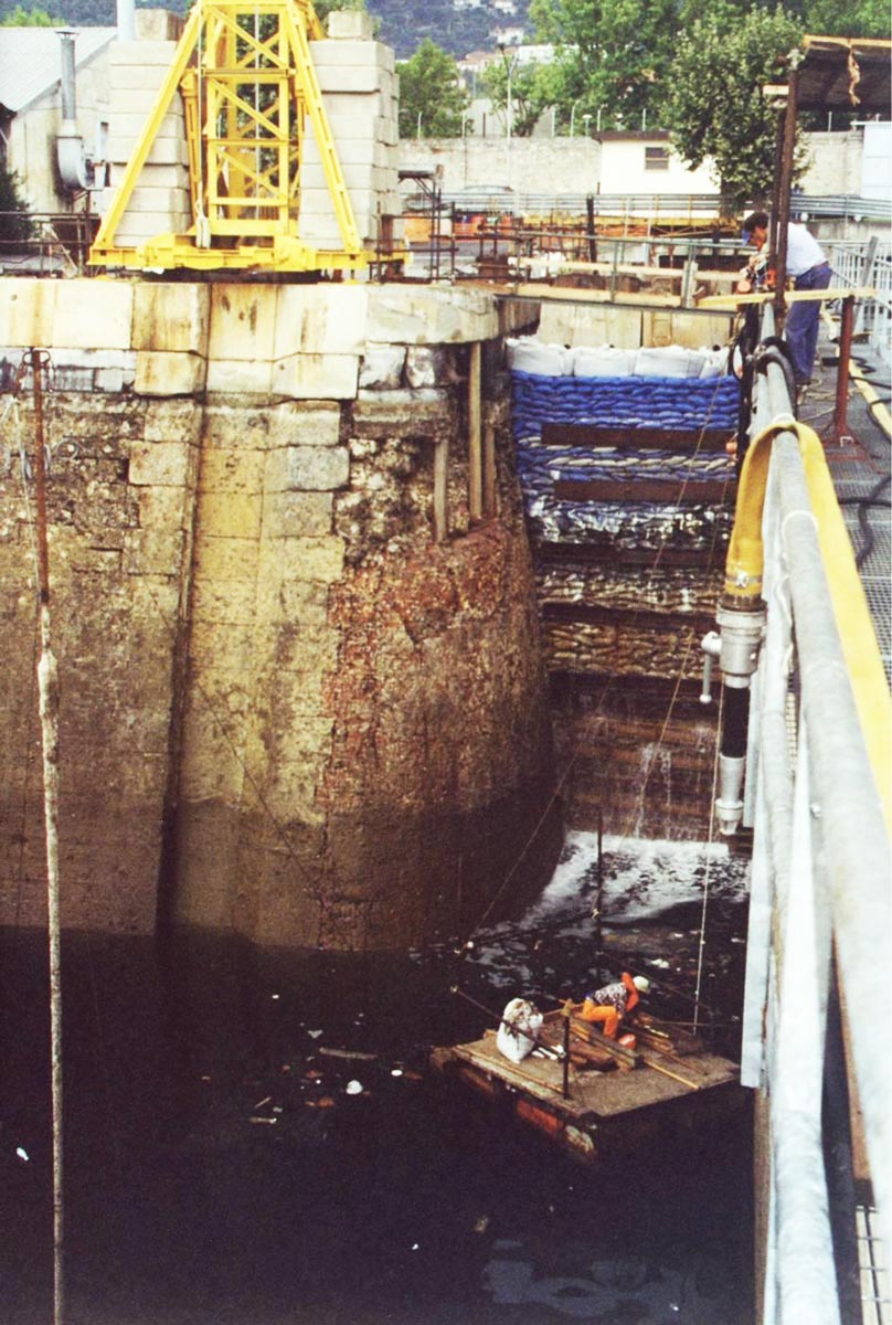 Costruzione di ture in sacchi nel cantiere di “Riparazione bacino 6 presso l’Arsenale M.M.